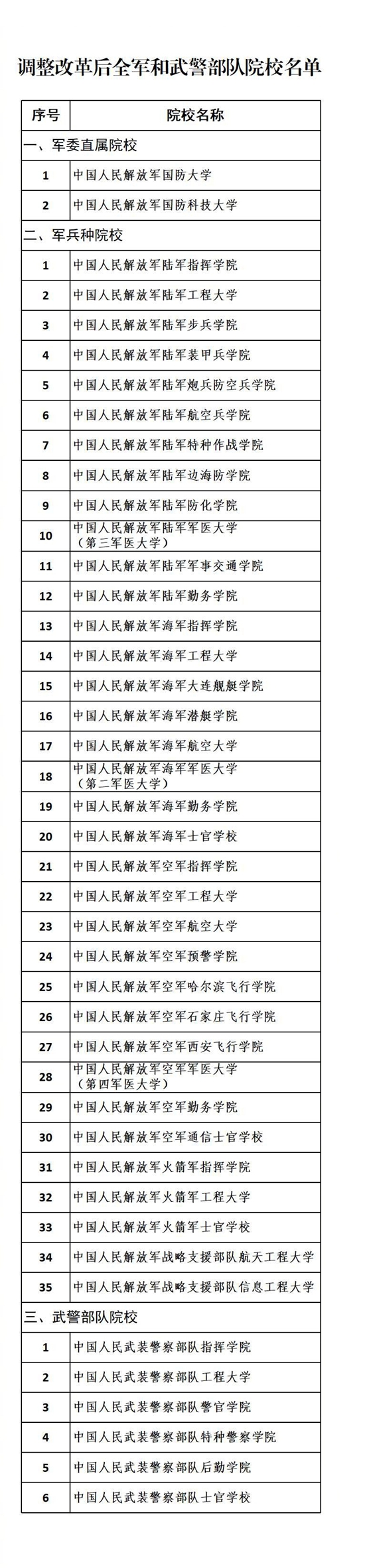吳謙透露,調(diào)整改革后,軍委直屬院校2所,軍兵種院校35所,武警部隊(duì)院校6所,總共43所。