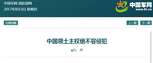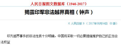 《人民日報》8月4日凌晨發(fā)表“鐘聲”題為“揭露印軍非法越界真相”的評論文章稱,何國家都不應(yīng)低估中國政府和人民捍衛(wèi)領(lǐng)土主權(quán)的決心,中國將采取一切必要措施維護自己的正當(dāng)合法權(quán)益。