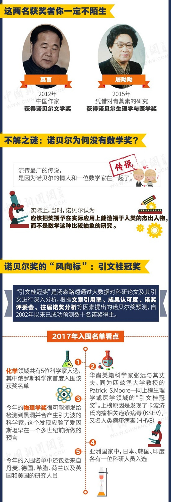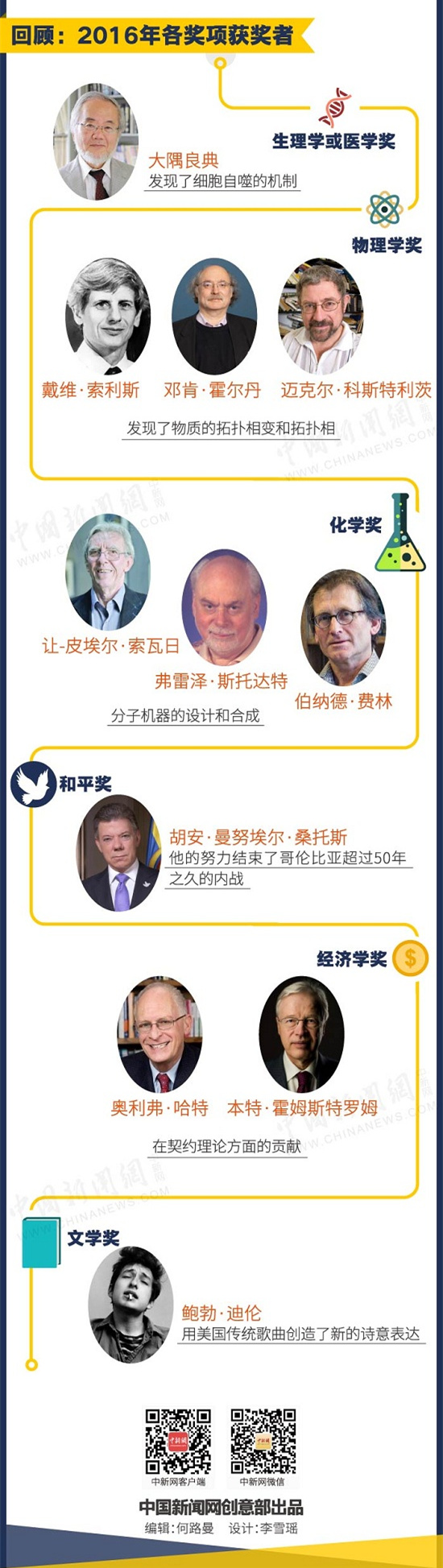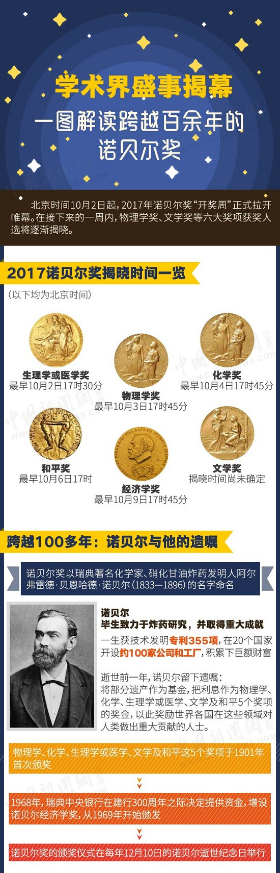 中新網(wǎng)10月2日電 金秋十月的第二天,2017年諾貝爾獎(jiǎng)?lì)C獎(jiǎng)周拉開(kāi)帷幕,全世界的目光都聚焦到瑞典。在接下來(lái)的幾天內(nèi),物理學(xué)獎(jiǎng)、文學(xué)獎(jiǎng)、經(jīng)濟(jì)學(xué)獎(jiǎng)等六大獎(jiǎng)項(xiàng)獲獎(jiǎng)?wù)呙麊螌⒅饾u揭曉。諾貝爾獎(jiǎng)有何由來(lái)?它的背后又有什么不為人知的故事?有哪些學(xué)者可能金榜題名?今年會(huì)不會(huì)有中國(guó)人獲獎(jiǎng)?中新網(wǎng)為您一圖解讀跨越百余年的諾貝爾獎(jiǎng)。