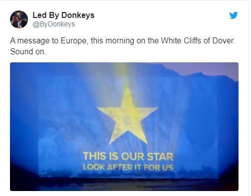 投影在英國(guó)多佛白崖上的視頻。圖片來(lái)源:社交網(wǎng)站截圖。