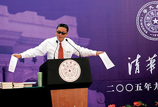 紅色領(lǐng)帶、藍(lán)色眼鏡,還有語氣、做派……李敖的造型風(fēng)格,并不讓清華大學(xué)臺下的那些洋溢著興奮、好奇的學(xué)生陌生。果然,到了自由提問時間,好幾個有幸“中彩”的學(xué)生,在提問之前,都不約而同地表示,他們是在“李敖有話說”這個節(jié)目中認(rèn)識并喜歡上“李大師”或“李大俠”的。