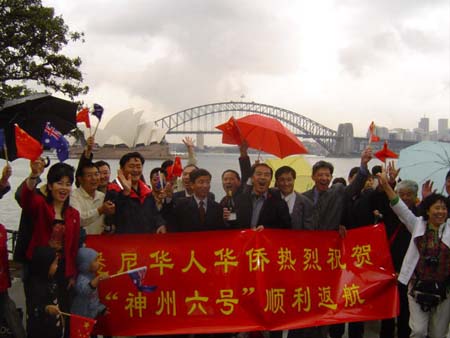 10月17日早晨9點(diǎn)多,悉尼僑界100多人聚集在風(fēng)景優(yōu)美的多曼島上,在標(biāo)志性建筑悉尼歌劇院和海港大橋前冒雨慶祝中國載人飛船神六順利回家。中國駐悉尼代總領(lǐng)事李超等參加了慶;顒(dòng)。
