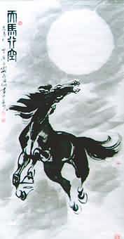 在他所有動(dòng)物畫中,只有奔馬是用寫意筆法,他認(rèn)為奔馬在人們心中是速度的代表,畫時(shí)必須用灑脫奔放、快速流暢的寫筆來揮灑,才能充分表現(xiàn)馬之精神,他曾用兩天時(shí)間完成了全長(zhǎng)18米,100匹形態(tài)各異、造型生動(dòng)的奔馬長(zhǎng)卷,由此可見,冰凍三日非一日之寒,他要用畫筆寫出駿馬的英俊、彪悍、勇猛、真誠(chéng)與耐勞。