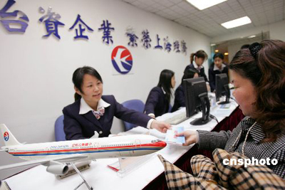 12月19日,2006年兩岸春節(jié)包機上海航點開始售票。由于今年“兩岸春節(jié)包機”向所有臺胞開放,所以機票格外緊俏,銷售也隨之火爆起來。(中新社/湯彥俊攝)