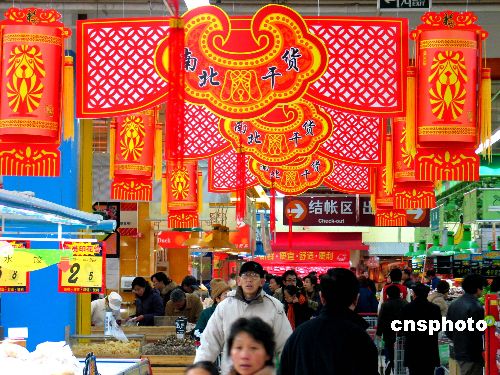 1月8日,市民在南京某超市“年貨大街”選購(gòu)年貨。雖然離農(nóng)歷新年還有20多天,但在這個(gè)雙休日,南京市的眾多商家不約而同地在場(chǎng)內(nèi)開設(shè)“年貨大街”,將種類繁多的年貨擺上柜臺(tái),供市民利用雙休日提前購(gòu)置年貨,商場(chǎng)內(nèi)人頭攢動(dòng),呈現(xiàn)出購(gòu)銷兩旺的喜人景象。 (中新網(wǎng)/鐘山 攝)