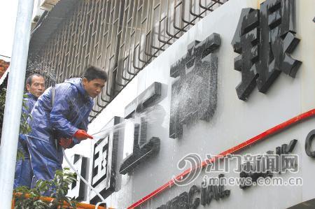 江門五邑僑鄉(xiāng)人都有“掃灰”過年的習(xí)慣,即年近歲晚把家居打掃干凈,把被帳衣物清洗干凈,以新的面貌迎接新年。近日,記者在江門市區(qū)見到,不少商鋪也在“掃灰”。圖中兩人正為一家銀行擦亮招牌,以迎接新春。(來源/江門日?qǐng)?bào))