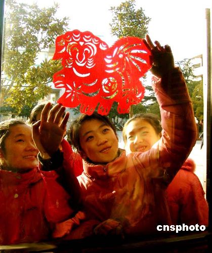 1月5日,春節(jié)日漸臨近,江蘇鹽城第二小學“四點半特色學!奔艏埌鄬W生,利用課余時間剪出56張“乖乖狗”作品裝點教室,迎接春節(jié)的到來。(中新社/凌成 攝)