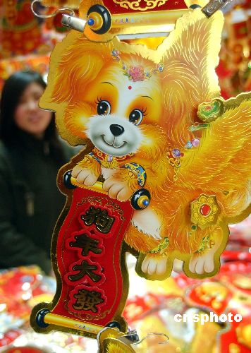 新年臨近,北京各大市場里的各類年貨熱銷起來。圖為北京天意新商城里扮像可愛的“天使狗”飾物吸引人們駐足觀看。(中新社/韓藝冰 攝)