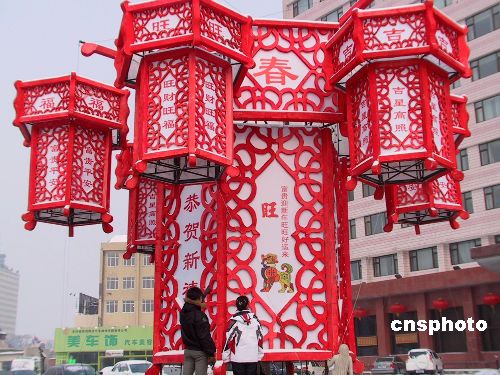 中國農(nóng)歷春節(jié)日益臨近,長春市一商家在門前制作了一只巨型宮燈,營造出喜慶祥和的氣氛,吸引眾多市民駐足觀看。這只巨型燈籠名叫六角宮燈,高8米,直徑6米,周邊陪襯著三對六只高3米、直徑2米的“小”燈籠。(中新社/王宇 攝)