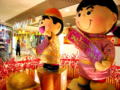香港一家購物商場設(shè)置福娃手持“花開富貴”、“恭賀新禧”,為即將到來的新春佳節(jié)增添喜氣。(香港大公網(wǎng))