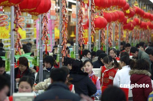 一月二十五日,距離中國傳統(tǒng)的農(nóng)歷春節(jié)狗年還有數(shù)日,北京節(jié)日市場呈現(xiàn)出紅紅火火的景象,許多商場、超市布置的喜氣洋洋,為即將過佳節(jié)的人們增添節(jié)日的愉快。(中新社/任海霞 攝)