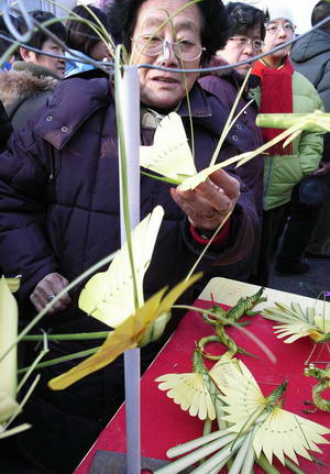 上午不到9點(diǎn),還沒(méi)正式開(kāi)門(mén)迎客的地壇廟會(huì),已經(jīng)涌進(jìn)了大批游人?罩耧L(fēng)車(chē)、風(fēng)箏剪紙、鬼臉儺面、工藝編織、花環(huán)飾物、昆蟲(chóng)寵物、吉祥卡通……每個(gè)攤位前都擠滿(mǎn)了人。