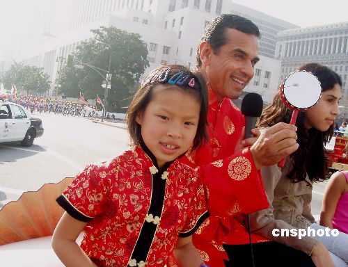 2月4日,美國(guó)洛杉磯市長(zhǎng)維拉萊戈沙穿上大紅唐裝,帶領(lǐng)華人兒童同車擔(dān)任中國(guó)城第117屆新年金龍大游行的總禮官,和各族裔民眾一起喜慶中國(guó)農(nóng)歷狗年。(中新社/賈國(guó)榮 攝)