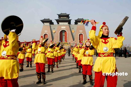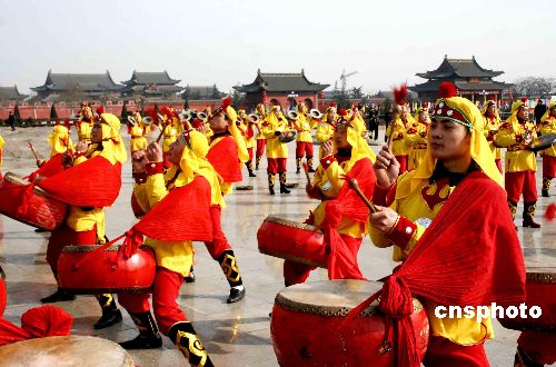2月8日,山西省臨汾市的堯廟廣場鑼鼓喧天非常熱鬧,市民載歌載舞鬧社火,期盼今年有個(gè)好收成。 (中新網(wǎng)/張旦 攝)