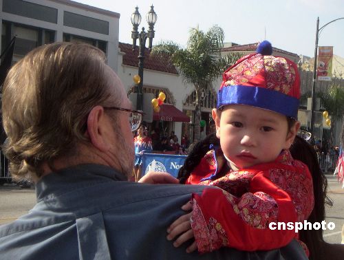一位美國父親抱著領(lǐng)養(yǎng)的中國小兒子,喜氣洋洋參加洛杉磯華人華僑歡慶中國農(nóng)歷狗年元宵節(jié)活動。(中新社/賈國榮 攝)