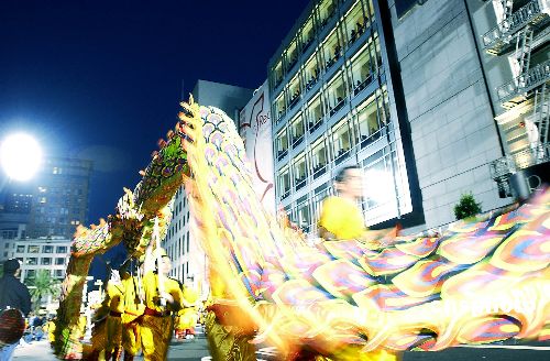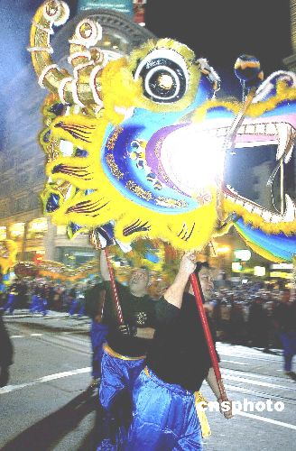 2月11日晚,美國舊金山華埠在聯(lián)合廣場舞龍慶元宵。(中新社/陳鋼 攝)