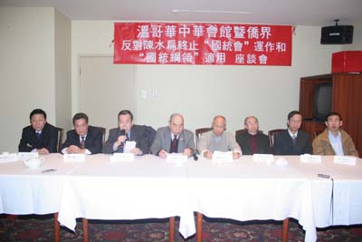 中新網(wǎng)溫哥華3月3日電(黃運(yùn)榮)溫哥華中華會(huì)館等60多個(gè)華人社團(tuán)今天舉行座談會(huì),反對(duì)陳水扁終止“國(guó)統(tǒng)會(huì)”和“國(guó)統(tǒng)綱領(lǐng)”的行為。會(huì)后,與會(huì)僑團(tuán)發(fā)表嚴(yán)正聲明,強(qiáng)烈譴責(zé)陳水扁的“臺(tái)獨(dú)”行徑。