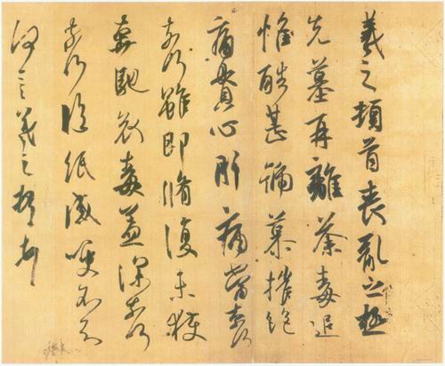 《喪亂帖》面目近于《頻有哀禍帖》,然轉(zhuǎn)折更為圓活流縱,字側(cè)仄更甚,墨色枯燥相間而出,至紙末行筆更為快疾?梢韵胍娮髡弋(dāng)時(shí)啜泣難止、極度悲痛之情狀。釋文:羲之頓首:?jiǎn)蕘y之極,先墓再離荼毒,追惟酷甚,號(hào)慕摧絕,痛貫心肝,痛當(dāng)奈何奈何!雖即修復(fù),未獲奔馳,哀毒益深,奈何奈何!臨紙感哽,不知何言!羲之頓首頓首。