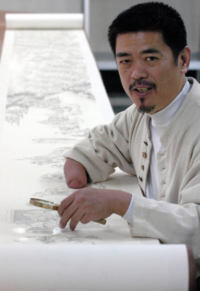 臺(tái)灣目前以中國(guó)傳統(tǒng)工筆畫(huà)技法作畫(huà)的名家屈指可數(shù),獨(dú)臂而又以左手繪畫(huà)的就更是獨(dú)一無(wú)二,他就是現(xiàn)年49歲的陳振益,畫(huà)釋道人物是其絕活,白描《五百羅漢圖》為他的代表作。