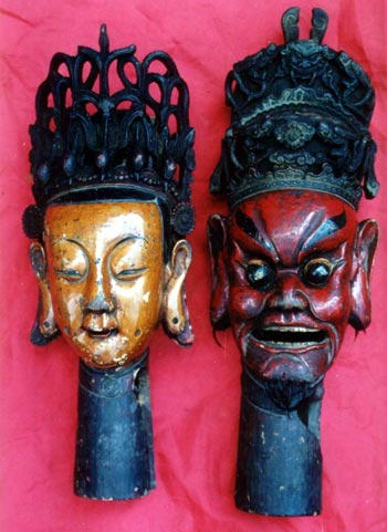 在儺祭中,面具起著十分重要的作用。儺祭之風盛行的商周時期,為了在儺祭中獲得強烈的祭祖效果,主持儺祭的方相氏佩戴著“黃金四目”面具。《周禮·夏官》說:“方相氏掌蒙熊皮,黃金四目,玄衣末裳,執(zhí)戈揚盾,帥百隸而時儺,以索室驅疫!狈较嗍铣闪恕膀尮碇鹨、消災納吉”的神化形象,那模樣神秘可畏。在儺戲表演中,面具則成了儺戲造型藝術的重要手段,也是儺戲最為重要、最為典型的道具。演員佩戴面具是儺戲區(qū)別于其他戲劇的重要特征。