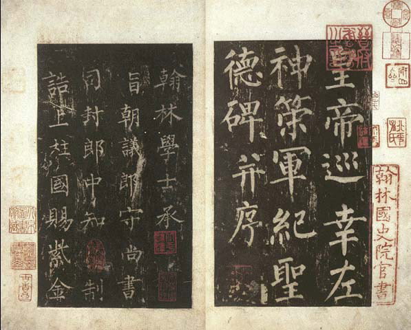 依慣例,此碑拓本曾頒賜群臣,但流傳不廣。原碑大約毀于唐末戰(zhàn)火,后世也便無(wú)從傳拓了,至今僅有國(guó)家圖書(shū)館現(xiàn)存的孤本傳世。北宋末期,趙明誠(chéng)在《金石錄》中曾著錄有一種分裝兩冊(cè)的《神策軍碑》拓本,這與國(guó)圖館藏恰好相同。因此,歷來(lái)猜測(cè)此本曾經(jīng)由趙明誠(chéng)、李清照伉儷珍藏。遙想當(dāng)年承平之日,趙明誠(chéng)、李清照以詩(shī)書(shū)、金石自?shī),摩挲賞玩的珍品中也有這件《神策軍碑》拓本,真是令人神往不已。
