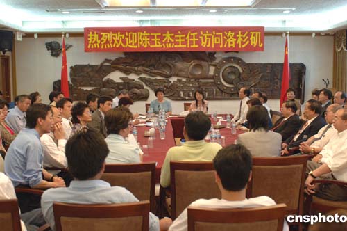 中國國務(wù)院僑務(wù)辦公室主任陳玉杰所率代表團三日與洛杉磯三十多位僑領(lǐng)座談。僑領(lǐng)們在“娘家人”面前暢所欲言,中國國家僑務(wù)主官們也是有問必答,僑領(lǐng)、僑官面對面,兩個多小時的對話交流仍意猶未盡。