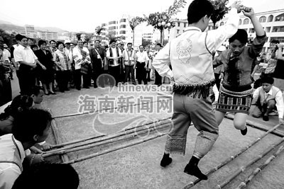 打柴舞有一套完整的舞具和跳法,舞具是有兩條墊木和數(shù)對小木組成。舞者跳入木棍中,來回跳躍、蹲伏,模仿人類活動和各種動物的動作及聲音。