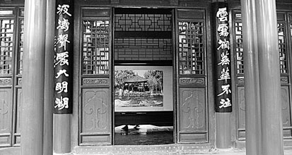 7月11日下午,記者來到趵突泉公園內(nèi),從公園大門向北走大約200多米,就來到著名的趵突泉邊。在趵突泉的北岸,有一組較大的古建筑群,通稱三大殿,最南的大殿叫做“濼源堂”。該殿為三間兩層,歇山飛檐,古色古香。在挹廈柱上,刻著一副對聯(lián):“云霧潤蒸華不注,波濤聲震大明湖”。字體雄渾有力,詩句生動傳神,恰與眼前的波光水影交相輝映。而這副對聯(lián)就取自趙孟頫的著名詩作——《趵突泉》。