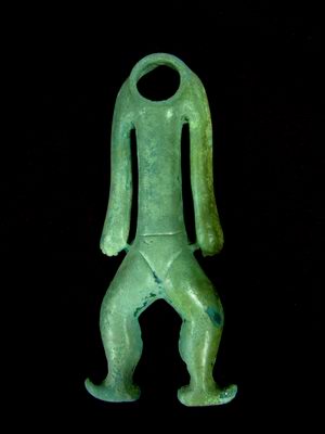 孫華介紹,金沙出土的青銅小立人僅有19.6厘米,這是金沙遺址中最具代表性的青銅器。它與三星堆出土的2米高的青銅大立人在造型方面極其相似,身上都穿著同樣的長衣,擺出同樣的姿態(tài),一只手空空地攥著拳頭。不同的僅僅是身高上的懸殊,但從金沙青銅小立人下面的一個(gè)小插件可以看出,它此前應(yīng)該是插在一個(gè)大件上的一個(gè)物品。除身高的不同,形制上看,兩個(gè)青銅立人所差無幾。