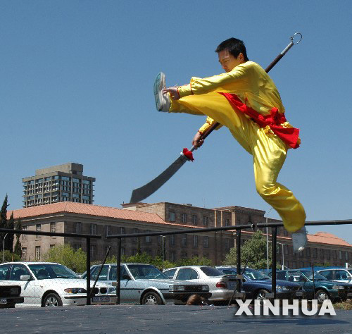 臺(tái)下,8名黑人旗手高舉印有八卦圖案的彩旗不停地變換隊(duì)形;臺(tái)上,一黑一白兩名武術(shù)愛好者正全神貫注地演繹著中國(guó)功夫的一招一式。而在觀眾席上,一張張不同膚色的面孔正凝神靜氣地欣賞他們精彩的表演。