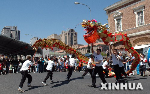 這是24日在約翰內(nèi)斯堡老唐人街上令人喝彩的一幕。在這里,上千名華人和當(dāng)?shù)厝藲g聚一起同慶中華文化節(jié)。
