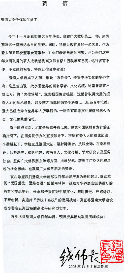 原全國(guó)政協(xié)副主席,中國(guó)科學(xué)院院士,暨南大學(xué)董事會(huì)董事長(zhǎng)、名譽(yù)校長(zhǎng)錢(qián)偉長(zhǎng)