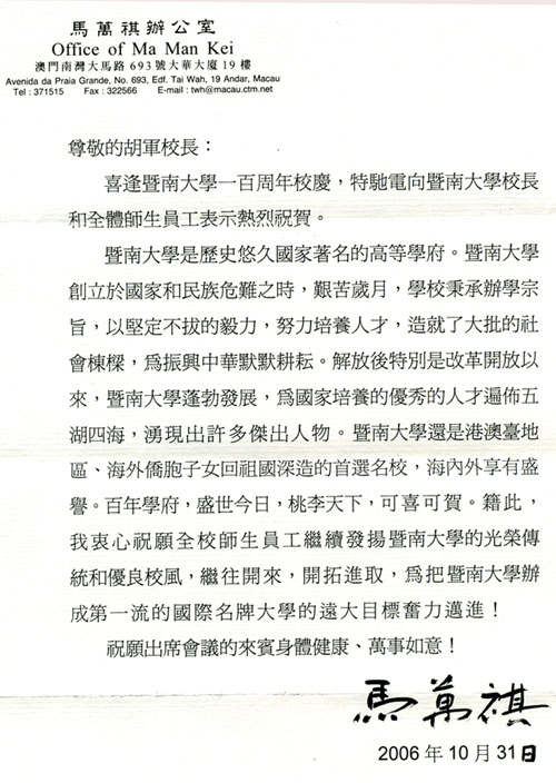全國(guó)政協(xié)副主席、澳門(mén)中華總商會(huì)會(huì)長(zhǎng)、澳門(mén)大華行投資有限公司董事長(zhǎng),暨南大學(xué)董事會(huì)副董事長(zhǎng)馬萬(wàn)祺