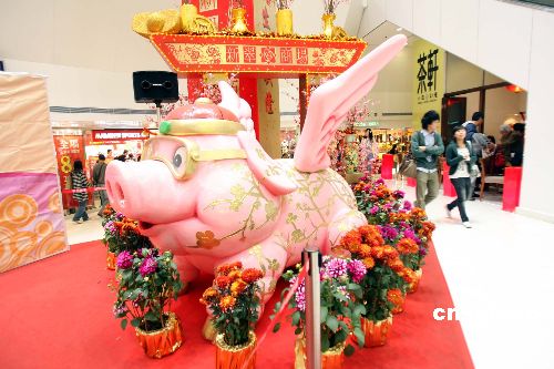 火樹(shù)銀花的香港這些天不斷變裝,以傳統(tǒng)風(fēng)俗喜迎新春:香港最著名的購(gòu)物中心時(shí)代廣場(chǎng)門前,數(shù)十個(gè)憨態(tài)可掬的“福豬”嬉戲;尖沙咀海港城,上千枝紅梅從地面攀上高空,與大紅宮燈搭成一條喜慶長(zhǎng)廊;灣仔街市,攤位上擺滿了火紅的春聯(lián)、“!薄暗摗薄皦邸薄办、燈籠和中國(guó)結(jié)。