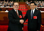 十屆全國人大一次會議3月15日舉行第五次全體會議。會議選舉胡錦濤為中國國家主席,江澤民為中央軍事委員會主席。圖為江澤民和胡錦濤當(dāng)選后親切握手。 |