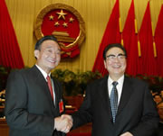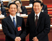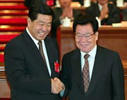 3月15日,吳邦國當(dāng)選第十屆全國人民代表大會常務(wù)委員會委員長。這是李鵬與吳邦國握手。 |