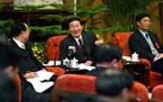 國務院總理朱镕基3月6日參加湖南代表團全體會議,聽取代表審議政府工作報告的意見和建議(新華社)