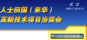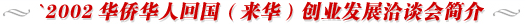 由國務(wù)院僑辦、湖北省人民政府暨武漢市人民政府共同舉辦的’2002華僑華人回國(來華)創(chuàng)業(yè)發(fā)展洽談會于5月28日——31日在武漢舉行。