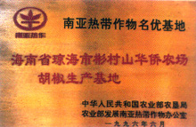 年被國家農(nóng)業(yè)部授予“南亞熱帶作物名優(yōu)基地”稱號。為了探索胡椒干果深加工技術(shù),開拓產(chǎn)品的市場銷路,農(nóng)場曾于1987年與國家科研單位合作進(jìn)行了從實驗室到工廠生產(chǎn)的研究試驗,成功地從胡椒干果中分離提取出胡椒油、胡椒堿和胡椒樹脂。