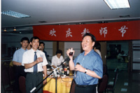 9月10日,國務(wù)院僑辦主任郭東坡、副主任李海峰、許又聲及各司局領(lǐng)導(dǎo)與北京華文學(xué)院全體教職員工歡渡教師節(jié)。圖為郭東坡主任(右)向大家祝賀節(jié)日。