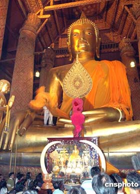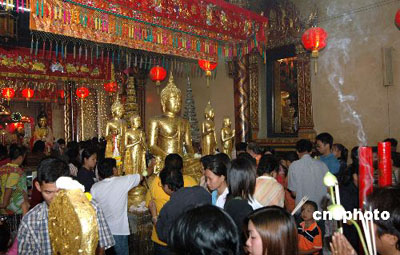 泰國古城的三寶公廟香客如潮,香燭臺前人頭擠擠,香煙繚繞,給鄭和神像獻(xiàn)荷花、進(jìn)香的香客排成長龍。
