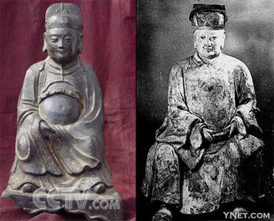 左:在印度發(fā)現(xiàn)的鄭和鎏金鐵像;右:福建長樂顯應(yīng)宮出土的鄭和塑像