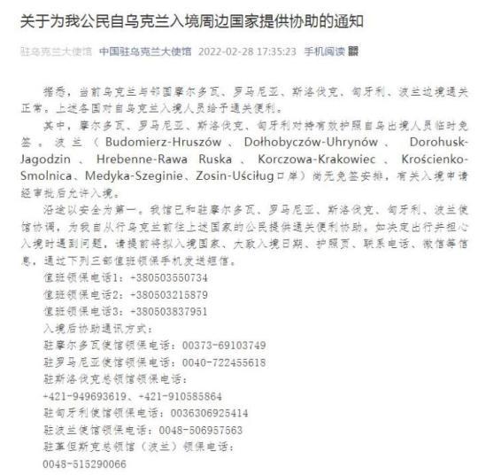 沿途以安全為第一。我館已和駐摩爾多瓦、羅馬尼亞、斯洛伐克、匈牙利、波蘭使館協(xié)調(diào),為我自從行烏克蘭前往上述國(guó)家的公民提供通關(guān)便利協(xié)助。如決定出行并擔(dān)心入境時(shí)遇到問題,請(qǐng)?zhí)崆皩M入境國(guó)家、大致入境日期、護(hù)照頁(yè)、聯(lián)系電話、微信等信息,通過下列三部值班領(lǐng)保手機(jī)發(fā)送短信。