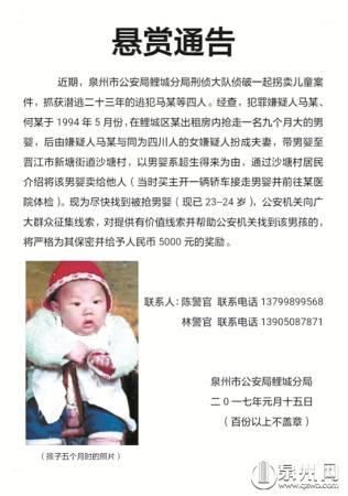 泉州網(wǎng)1月17日訊 (記者王麗虹 文/圖)昨(1月16日)日,一條懸賞通告在朋友圈被大量轉(zhuǎn)發(fā):23年前,犯罪嫌疑人馬某、何某在鯉城某出租房?jī)?nèi)搶走一名9個(gè)月大的男嬰,后該男嬰被賣(mài)給他人。近期,鯉城公安分局刑偵大隊(duì)偵破該起拐賣(mài)兒童案件,抓獲潛逃23年的逃犯馬某等4人,現(xiàn)鯉城警方向廣大群眾征集線(xiàn)索,對(duì)提供線(xiàn)索并幫助找到男孩的(現(xiàn)已23—24歲),將為其保密并給予5000元的獎(jiǎng)勵(lì)。