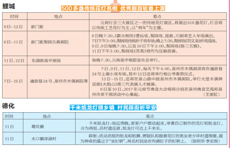 1月27日至2月12日,石獅市萬祥圖書館(祥芝)將舉辦花燈展;2月11日在石獅玉湖果蔬批發(fā)市場廣場,2017全國龍獅大聯(lián)動文藝演出上演。 (陳靈 詹偉志)