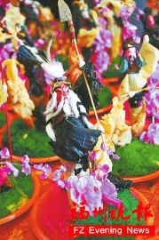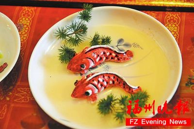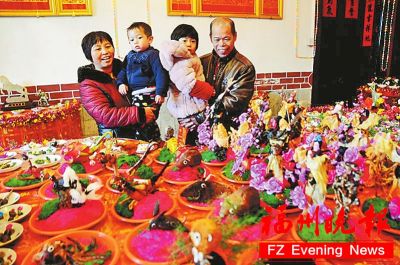 在頭座厝屋里,只見大廳上擺出長方桌數(shù)張,桌上還擺著五盆、十二碗、三十六碟等文武宴。案頭前則陳列著用豬心、豬肝、雞、魚、蟹等拼成的“五鳳”宴,還有惟妙惟肖的面食海族產(chǎn)品。