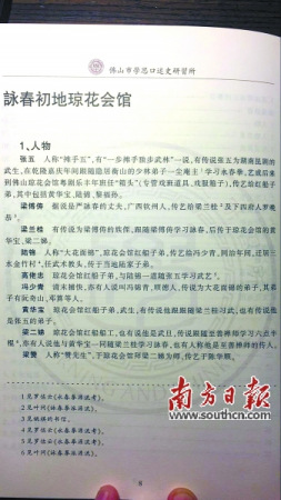 佛山市學(xué)思口述史研習(xí)所團(tuán)隊(duì)耗費(fèi)6年編撰的《佛山市禪城區(qū)詠春文化地圖》內(nèi)容節(jié)選。 資料圖片
