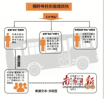 經(jīng)初步審查查明,該犯罪團(tuán)伙主要以在粵“蛇頭”許某飛、在桂“蛇頭”韋某輝、東南亞籍“蛇頭”農(nóng)某雪等人為首,通過(guò)招募和唆使的方式,組織東南亞籍人員偷渡入境后非法務(wù)工。