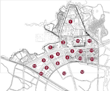 “四片區(qū)”即沿城鎮(zhèn)中軸,依據(jù)功能不同,劃分為教學(xué)區(qū)、城鎮(zhèn)區(qū)、運(yùn)動(dòng)公園區(qū)和生態(tài)濕地區(qū)四大片區(qū),并分散式布置多功能節(jié)點(diǎn),形成以學(xué)帶研、以研帶游、以游興城、以城促學(xué)的全新系統(tǒng)形態(tài)和創(chuàng)新模式。