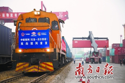 2016年4月14日下午,滿載著家電、家具、機(jī)械配件、通訊器材等產(chǎn)品的X8426次中歐鐵路集裝箱班列緩緩駛出東莞石龍站,一路北上,經(jīng)滿洲里鐵路口岸出境,途經(jīng)俄羅斯、白俄羅斯、波蘭等國(guó)家和地區(qū),預(yù)計(jì)19天后到達(dá)13000公里外的德國(guó)杜伊斯堡。這是目前國(guó)內(nèi)運(yùn)距最長(zhǎng)的中歐班列?!半p向班列”的開行不僅打通了珠三角地區(qū)貨物走出國(guó)門的通道,也暢通了一條境外貨物通往珠三角地區(qū)的環(huán)保通道。 2017年4月11日,新增中歐班列X8426從東莞石龍出發(fā),它將開往俄羅斯卡盧加州沃爾西諾。